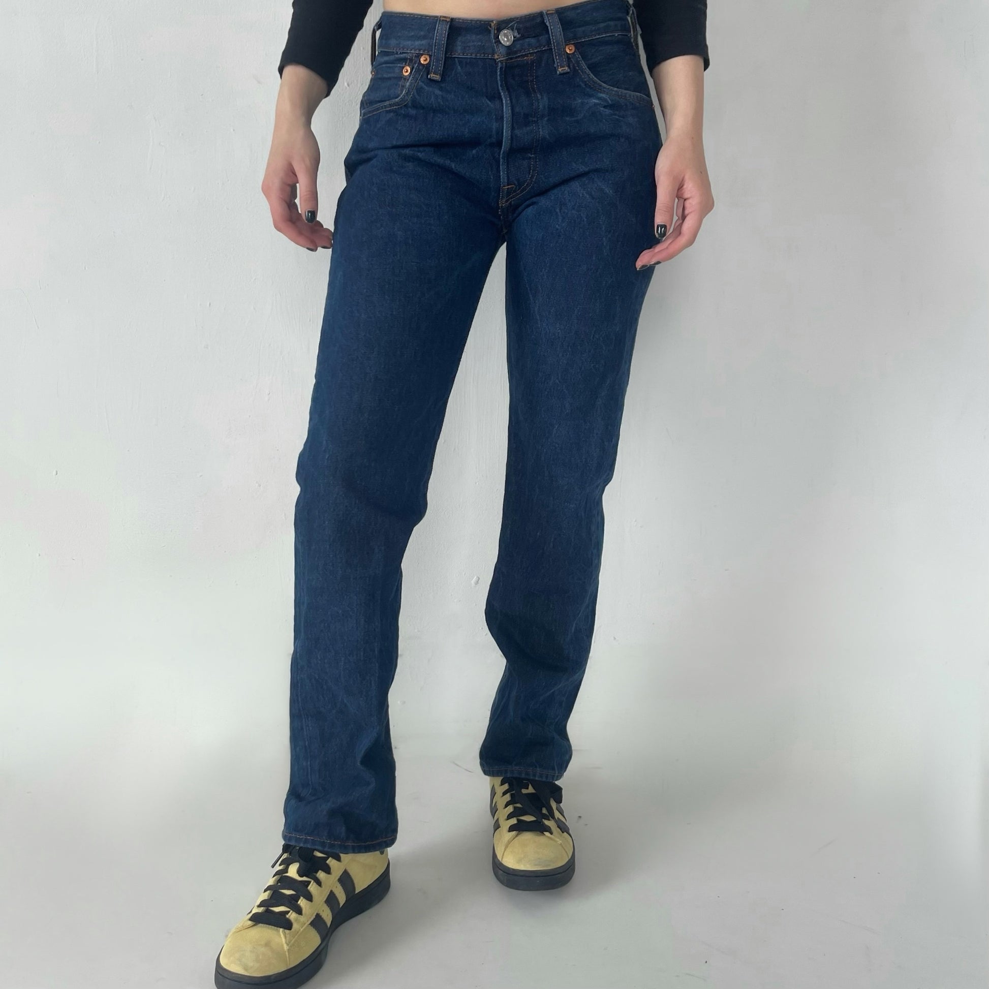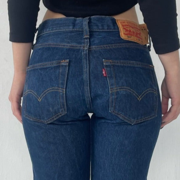 501 dark wash levis W29 L32. waist measures closer to 28 inches.