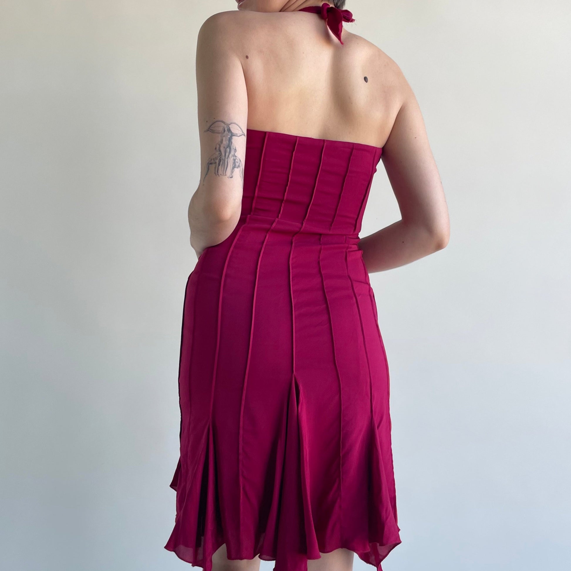 alberta ferretti halter dress in a stunning magenta/red color. marked a size 8 but refer to measurements and keep in mind it is adjustable due to the adjustable halter neck:
