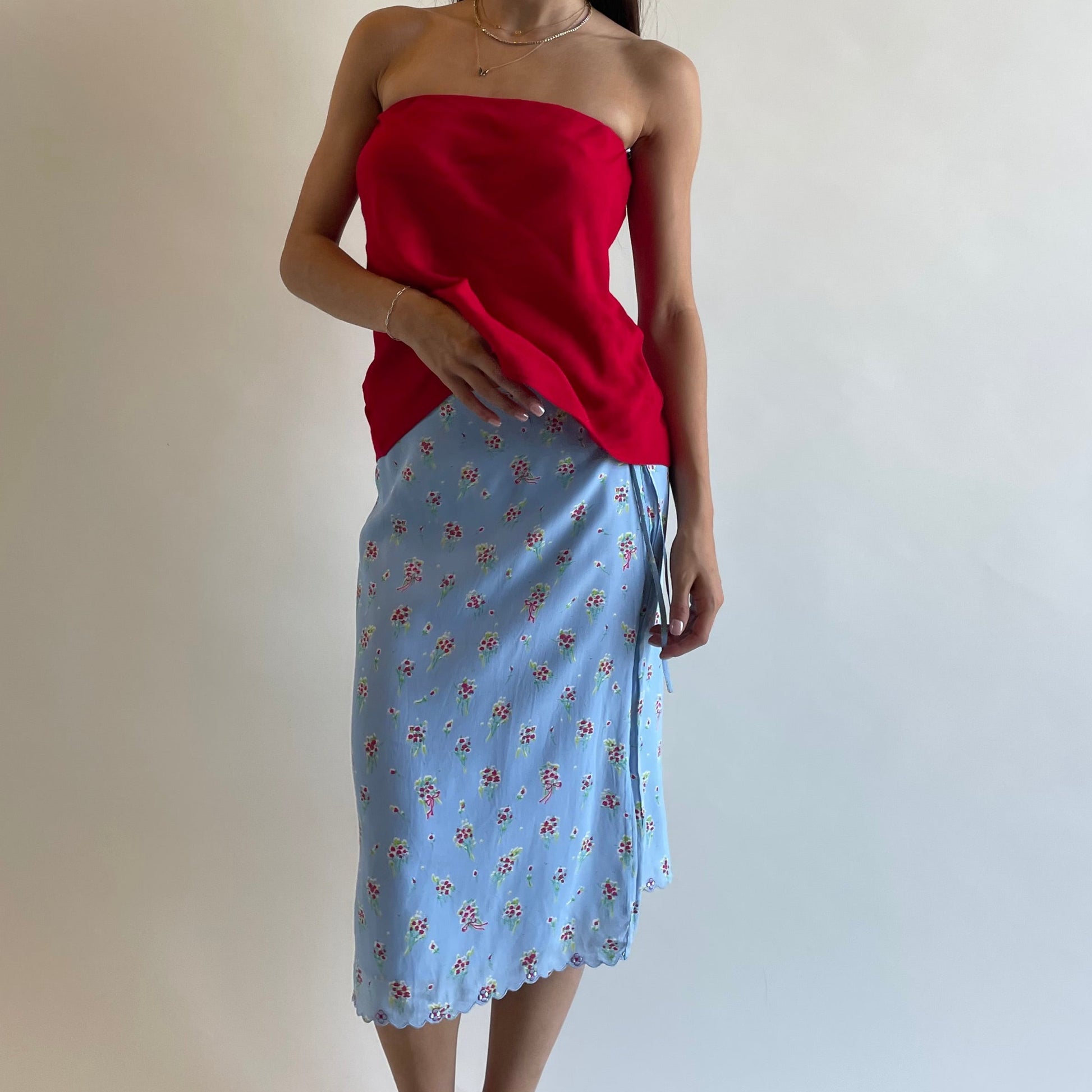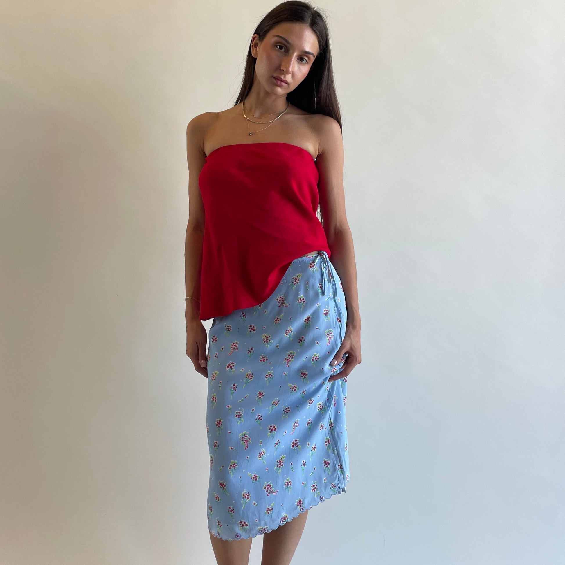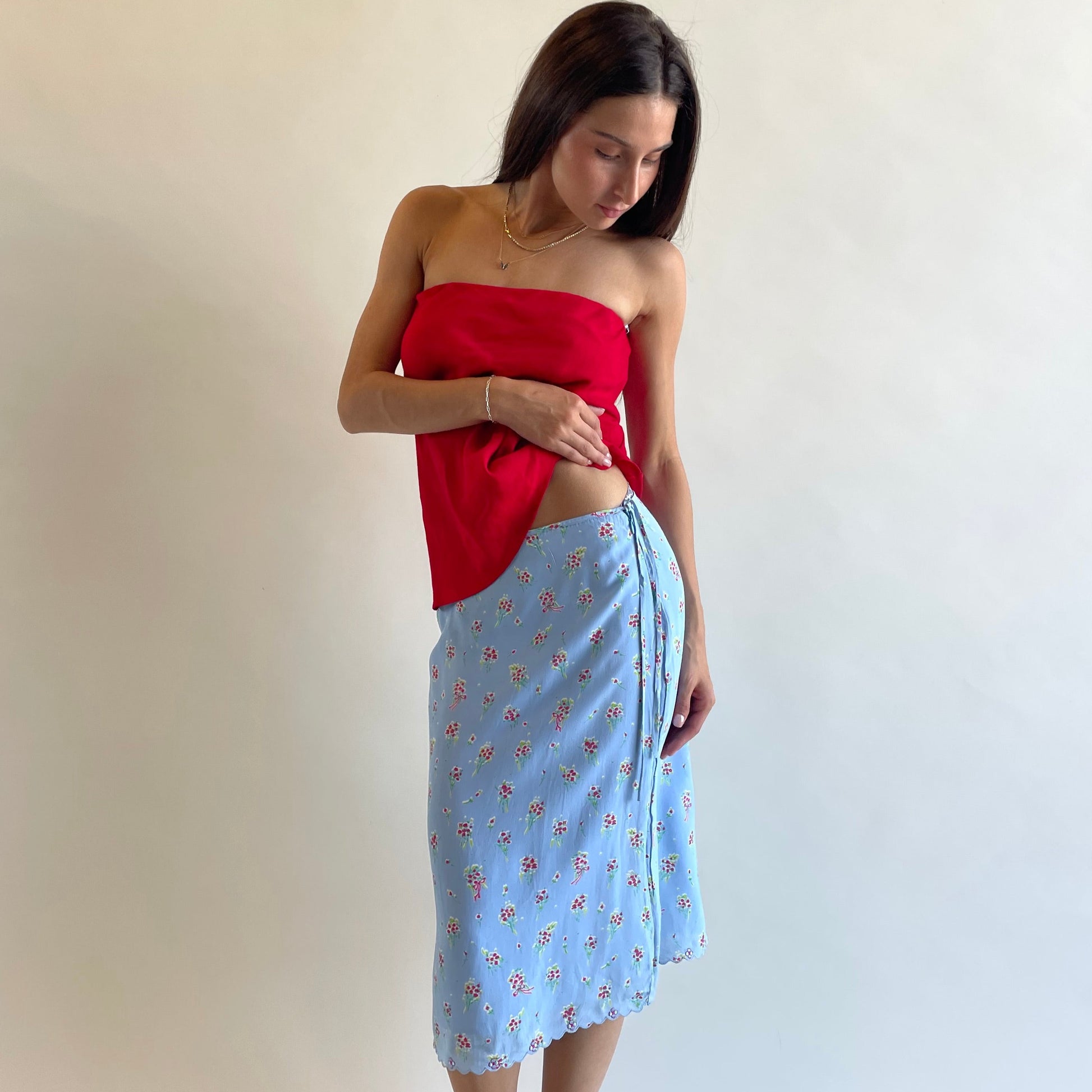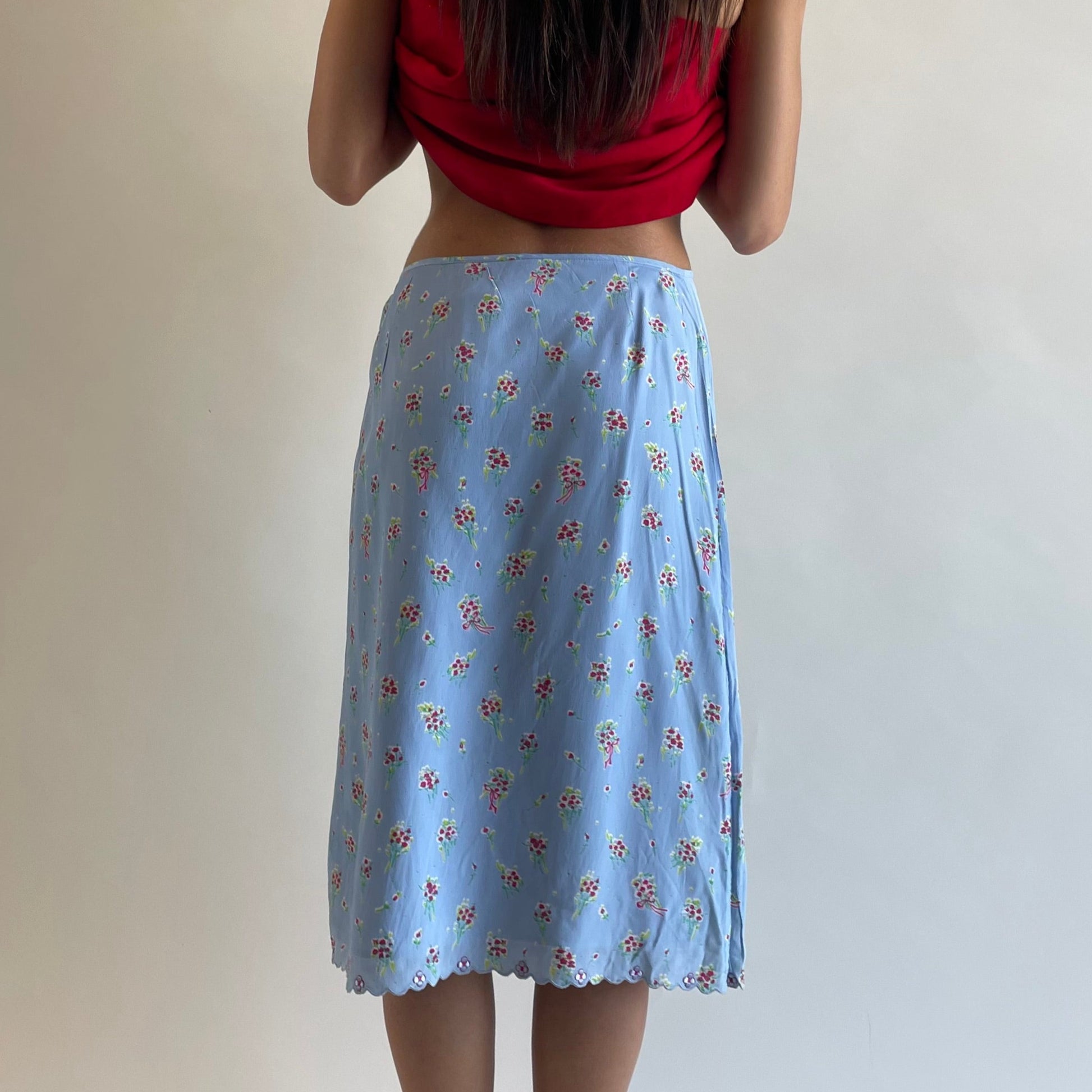 blumarine blue skirt with bouquet pattern. love the little tie detail on the hip!! marked a size IT 40 but refer to measurements: