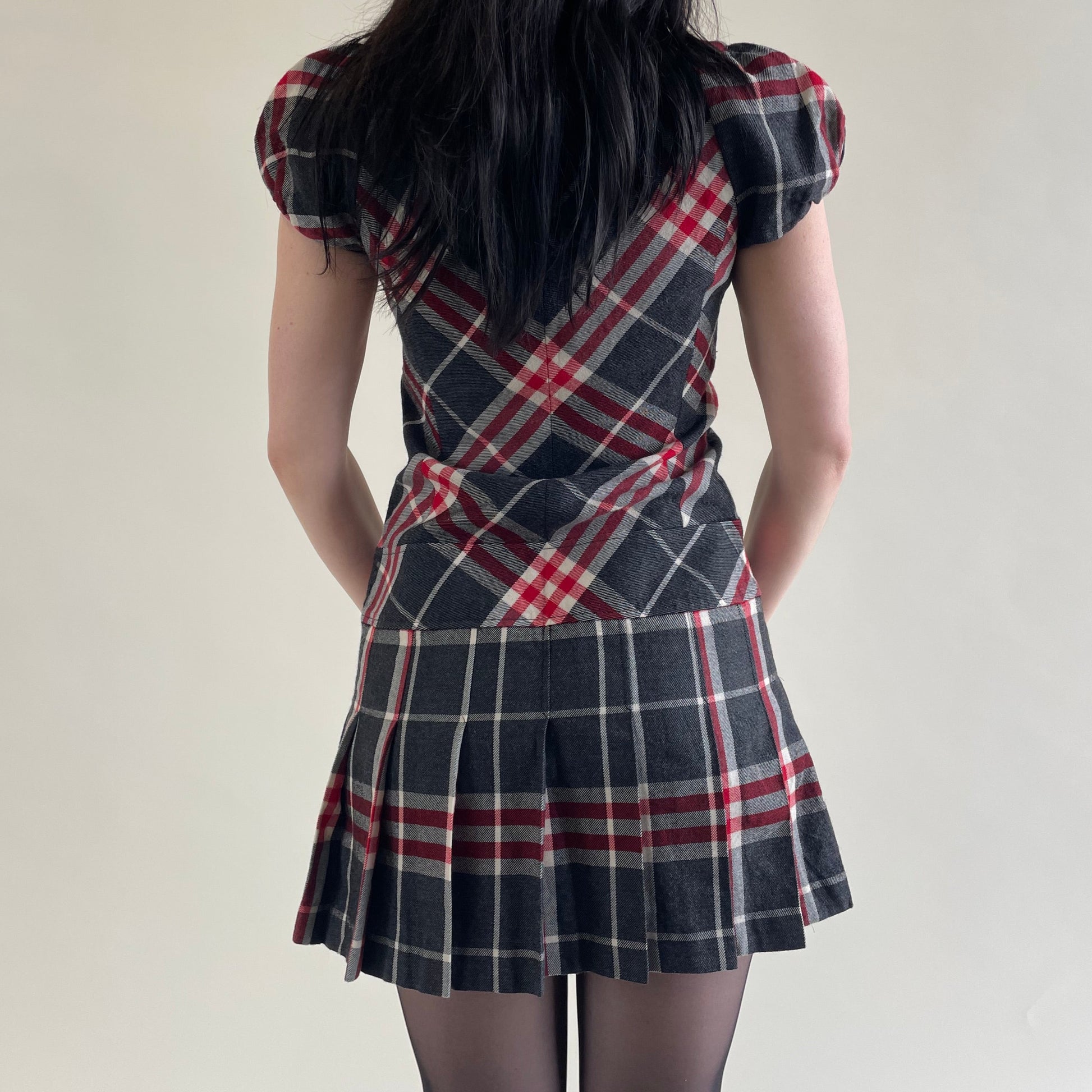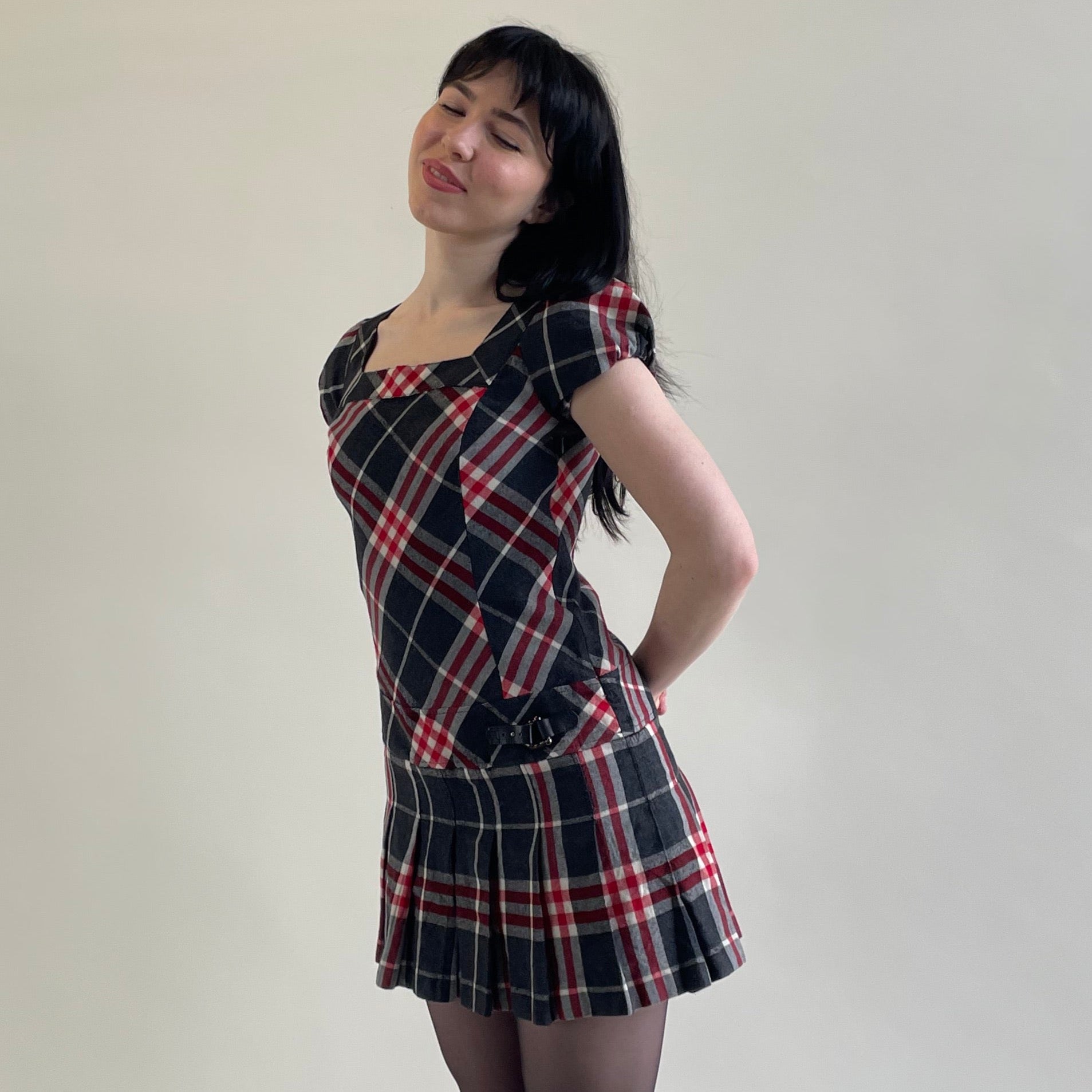 burberry blue label plaid drop-waist mini dress with buckle detail on hip and pleating at the bottom. has an invisible zipper on the side. marked a size 36 but refer to measurements: