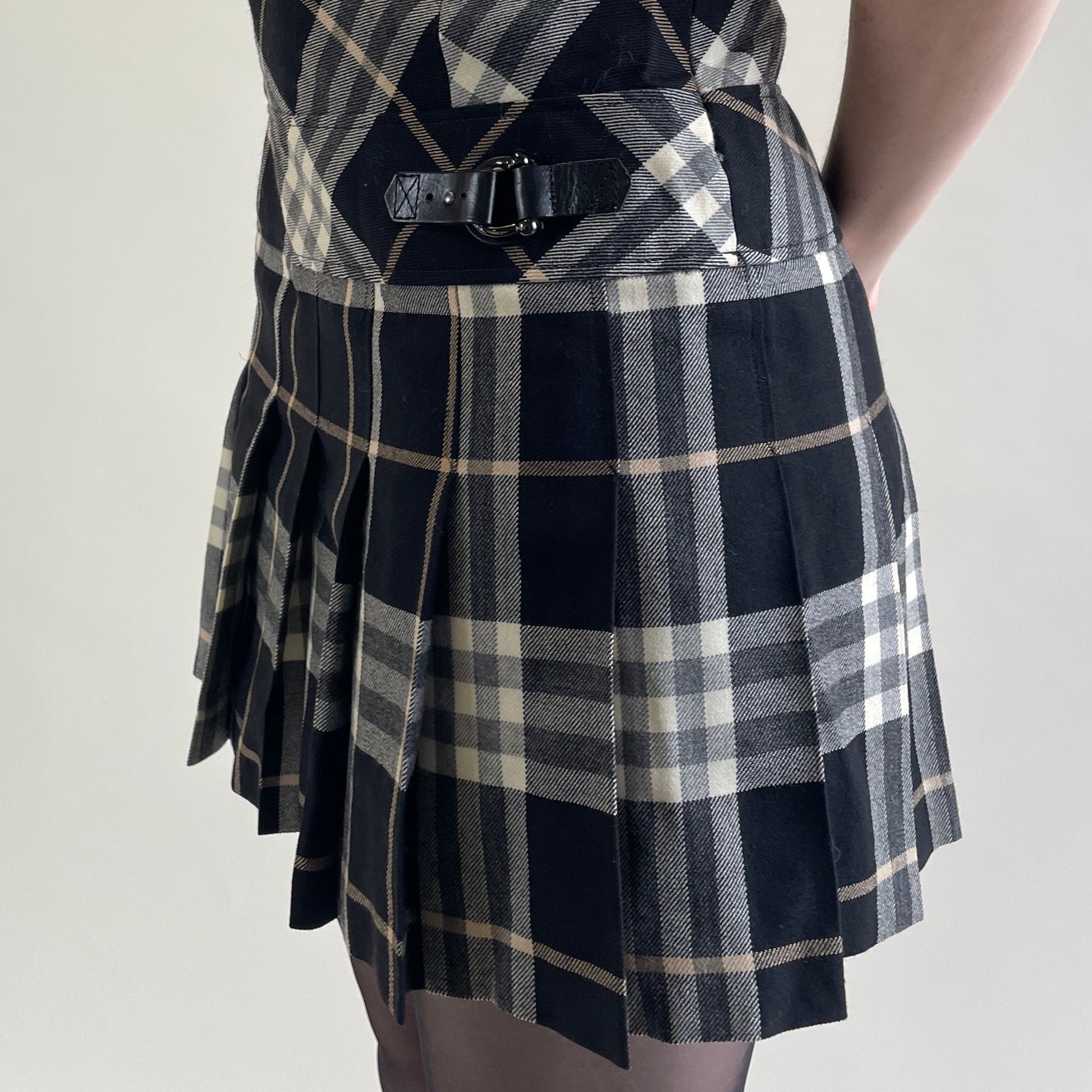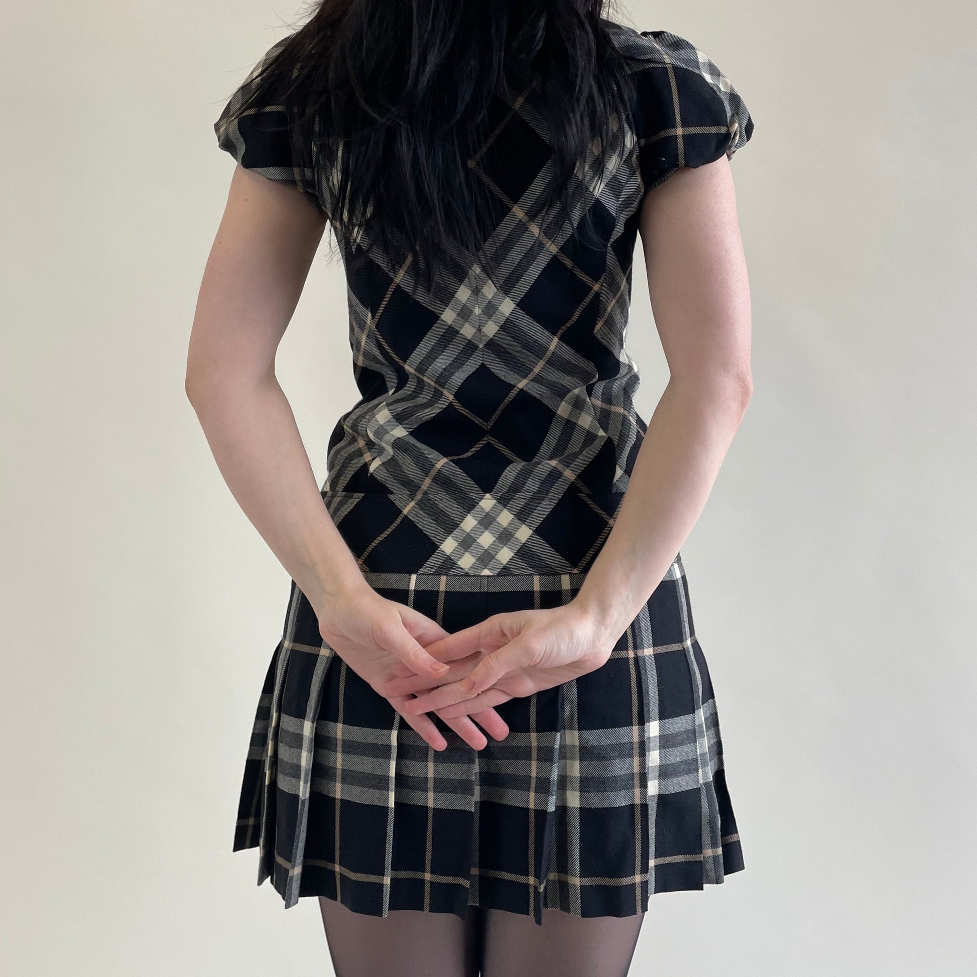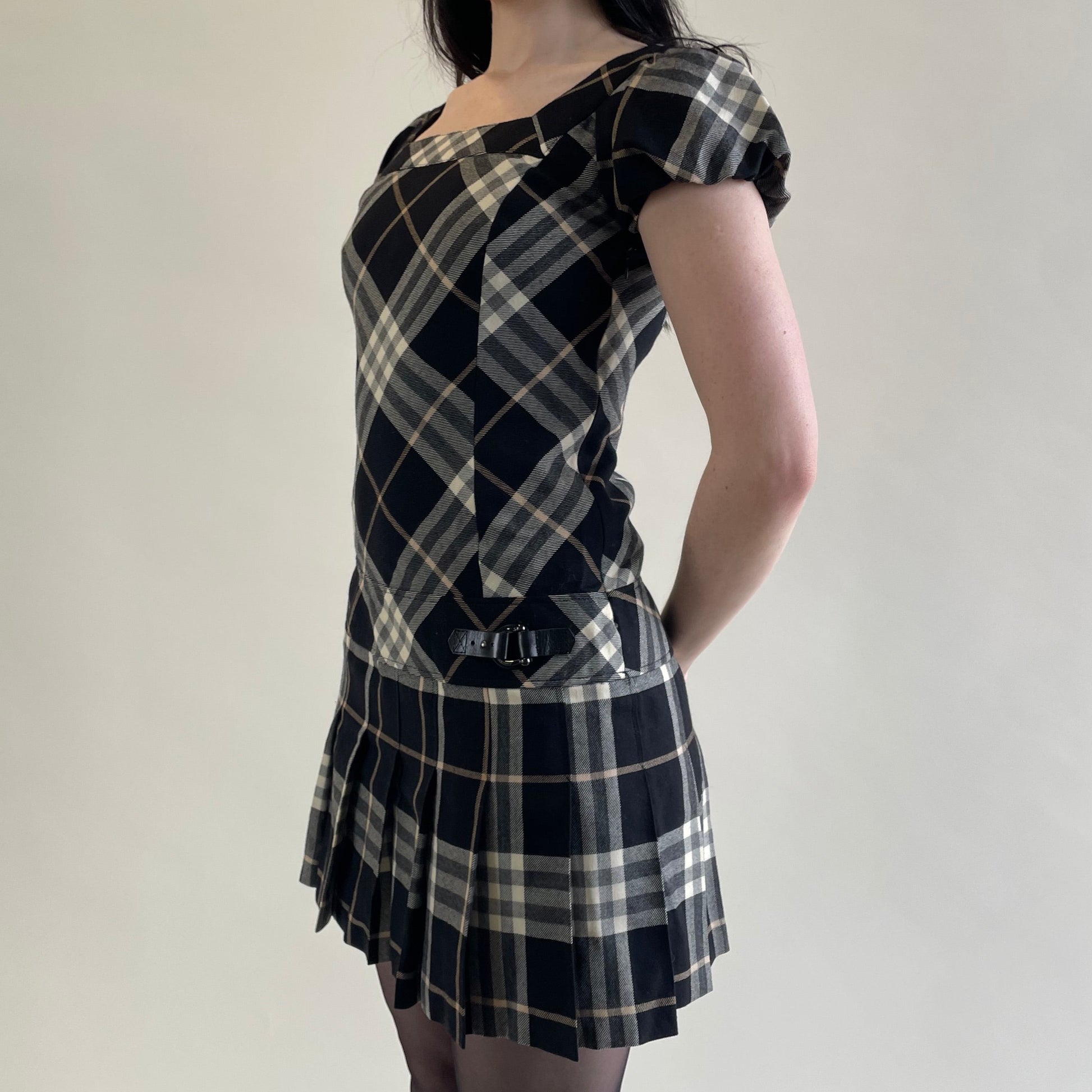 burberry blue label plaid drop-waist mini dress with buckle detail on hip and pleating at the bottom. has an invisible zipper on the side. marked a size 36 but refer to measurements: