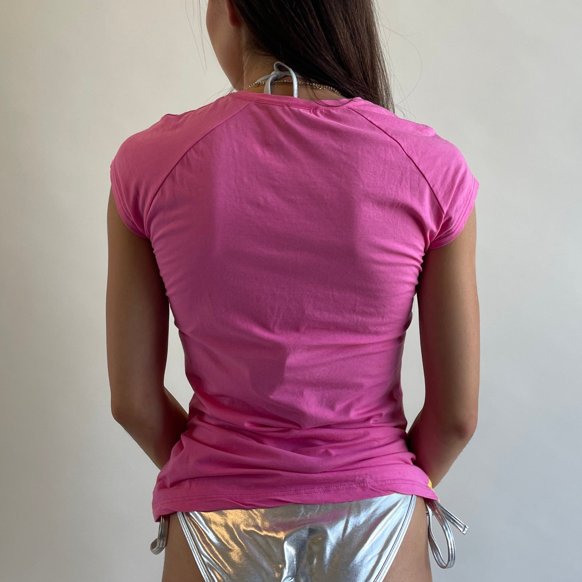dolce & gabbana yellow and pink tee with silver "D&G Beachwear" graphic. marked a size US 2 but refer to measurements: