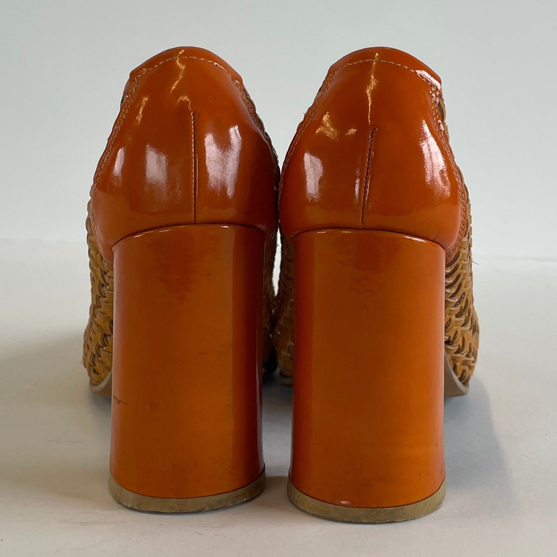 perfect woven miu miu heels with orange patent leather & bow detail <3 in great condition. marked a size 36 1/2 but they run slightly big so they could possibly fit a 37.