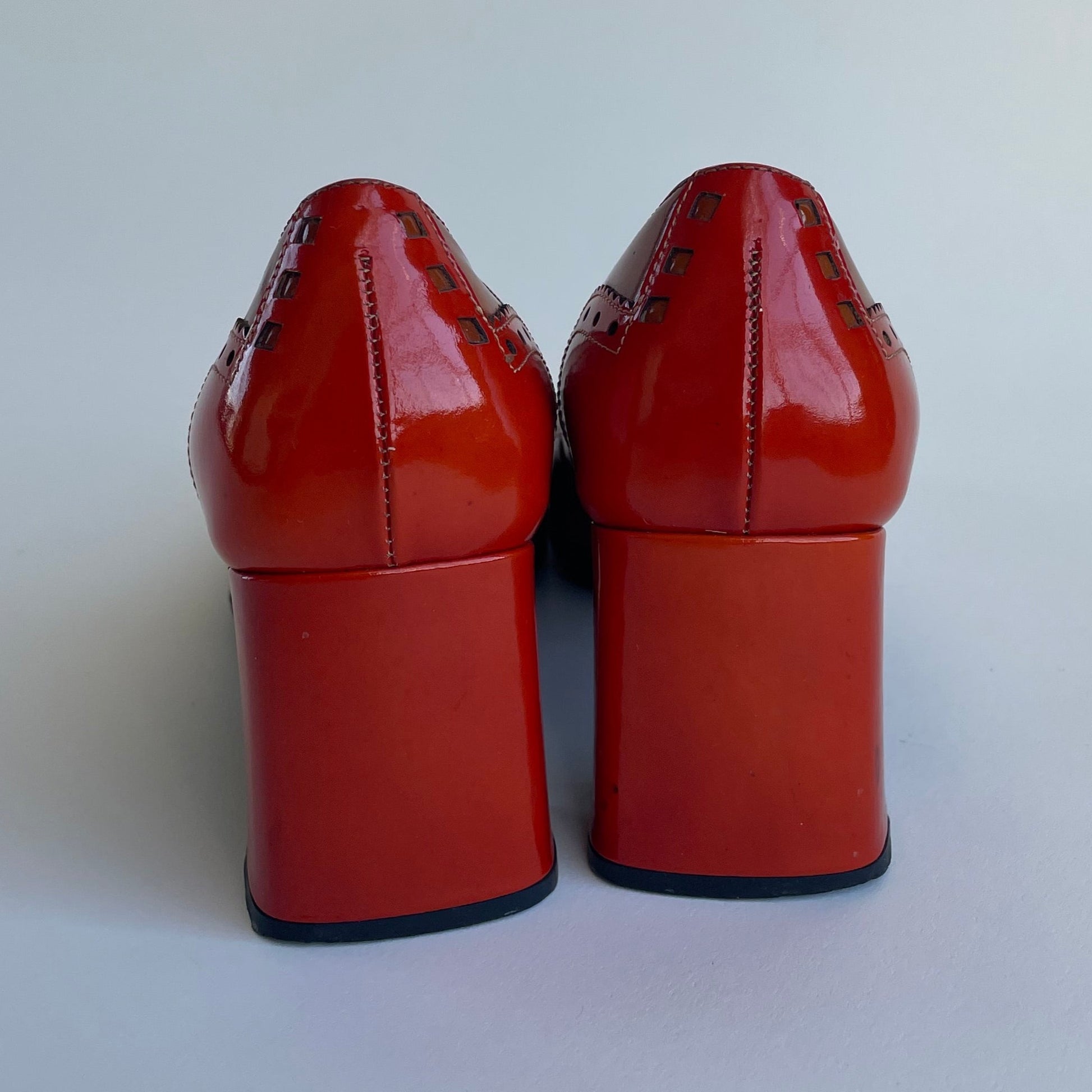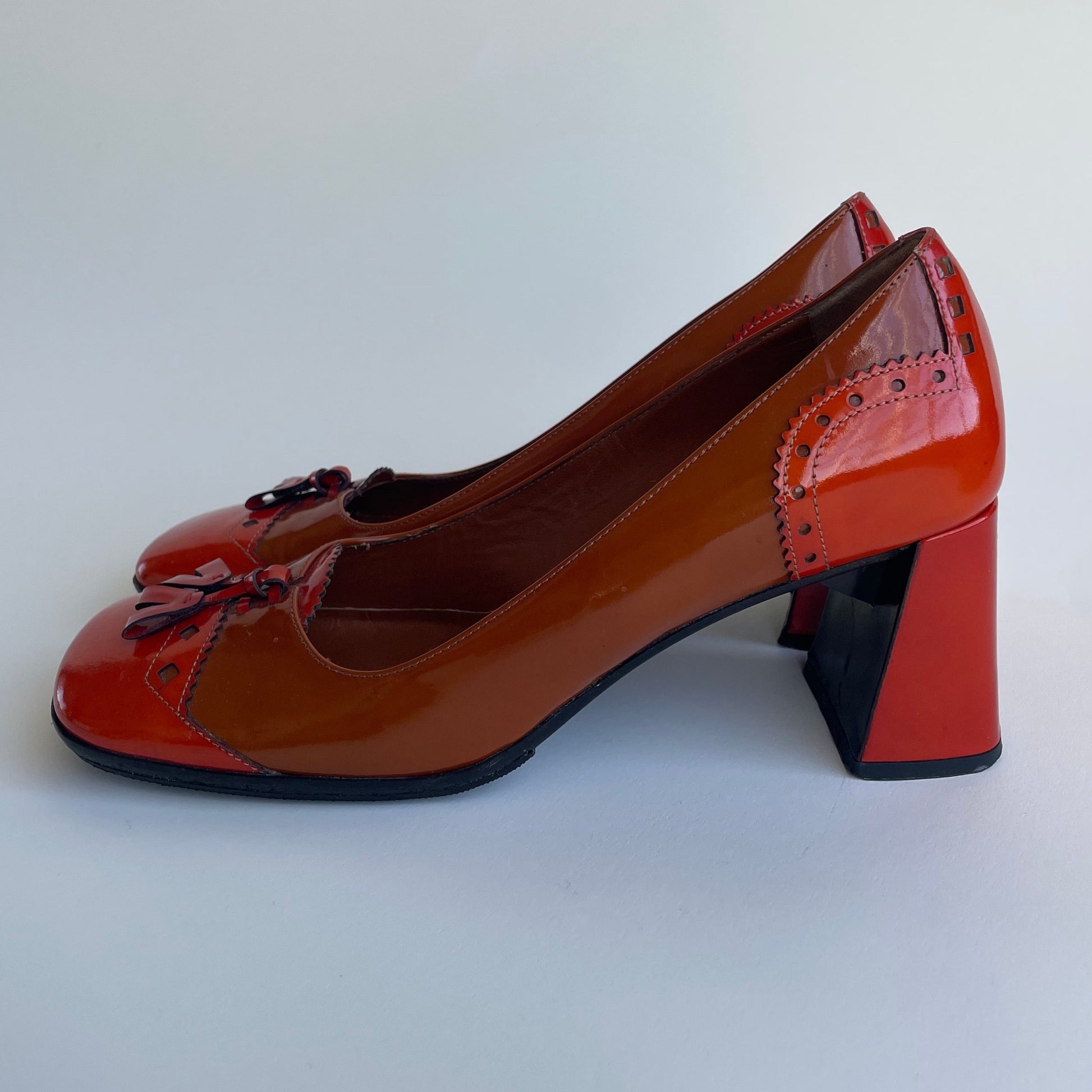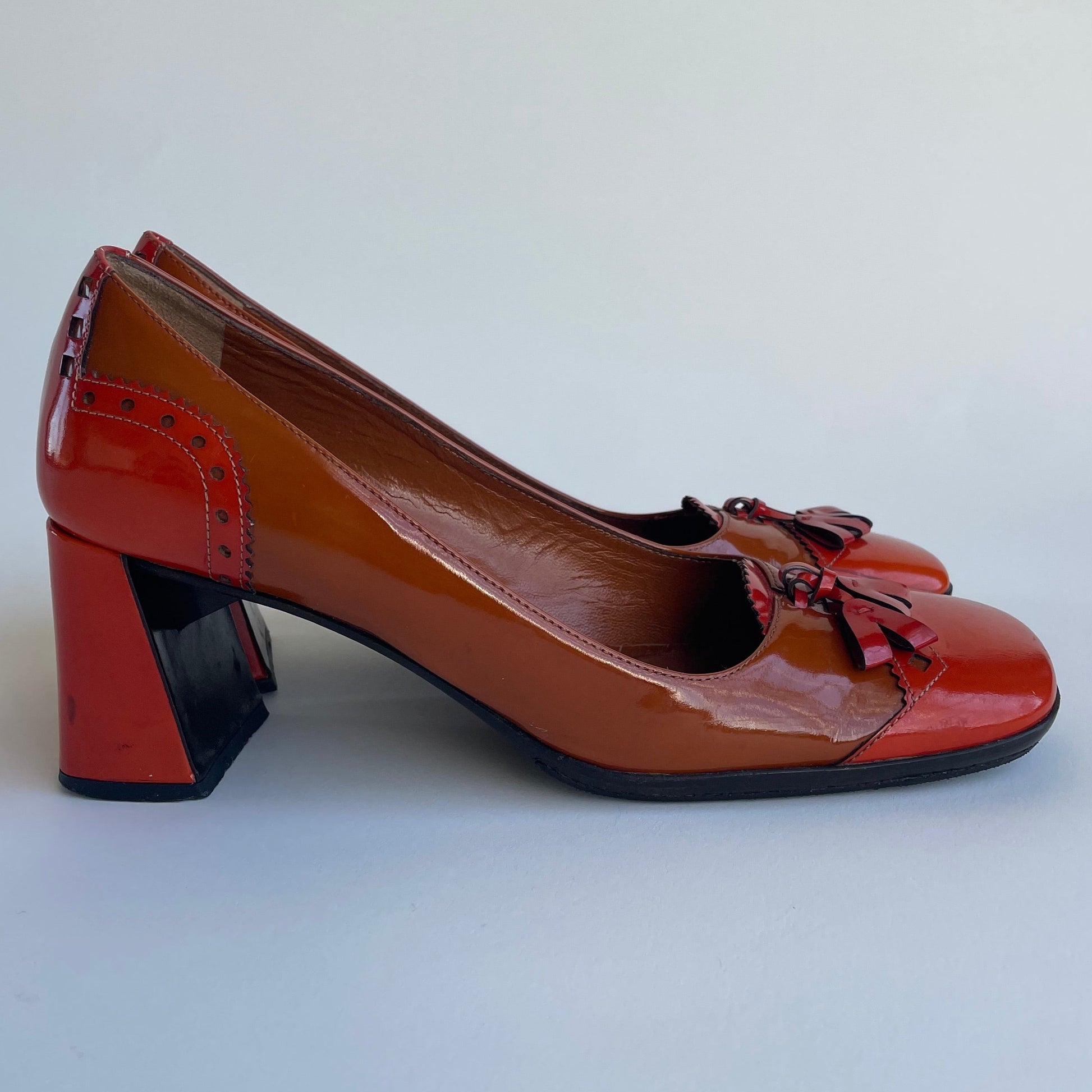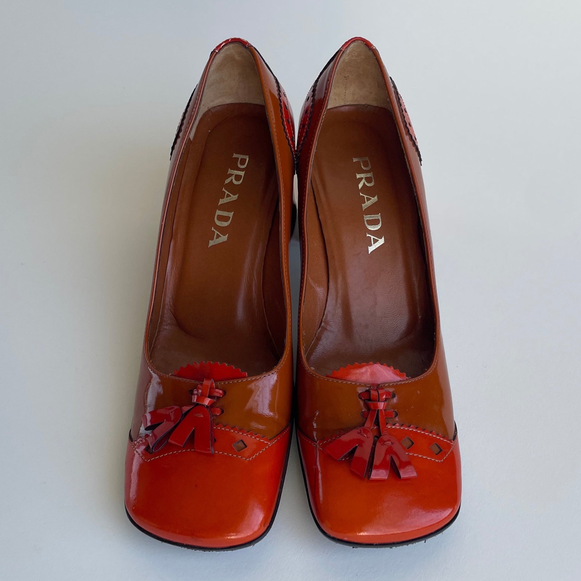 prada fw 1999 two-tone patent leather heels with tassels. such an iconic pair of heels. in such a beautiful color way. in gorgeous condition besides a small scuff on back of right heel and inside of left shoe. these appear to not be stains and could be cleaned at home or at a cobbler. size 36