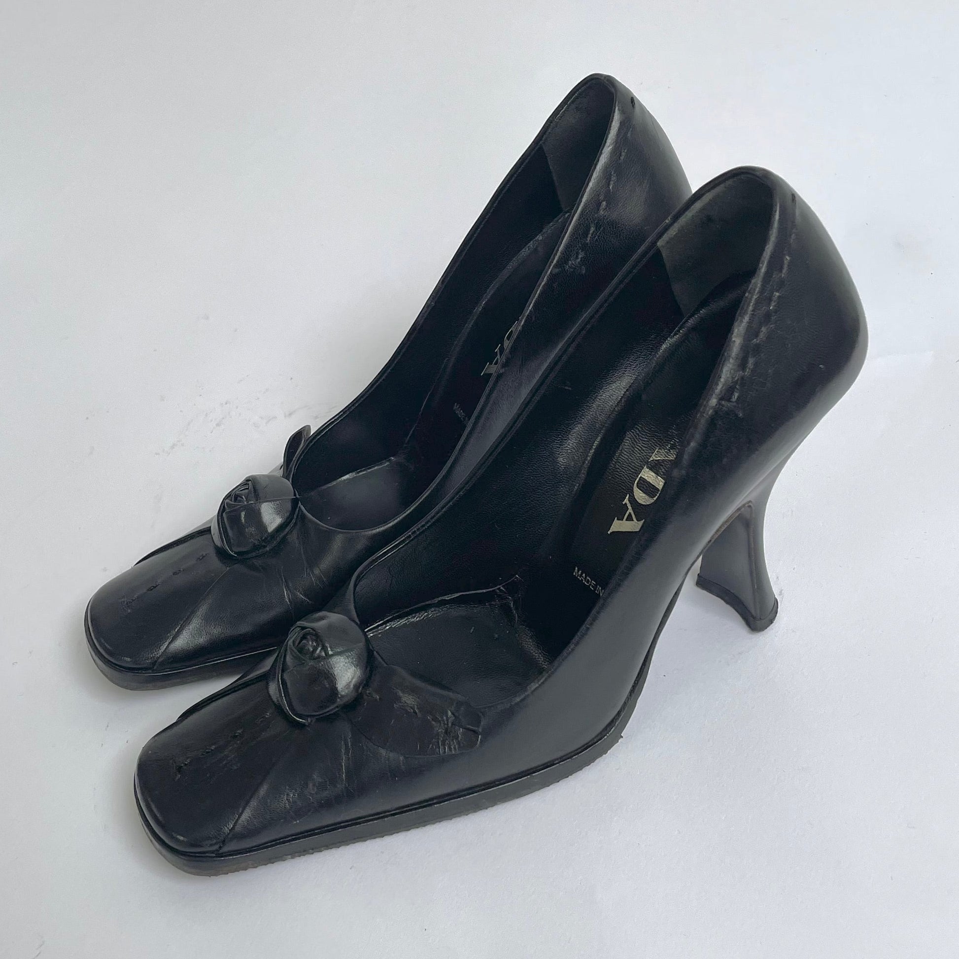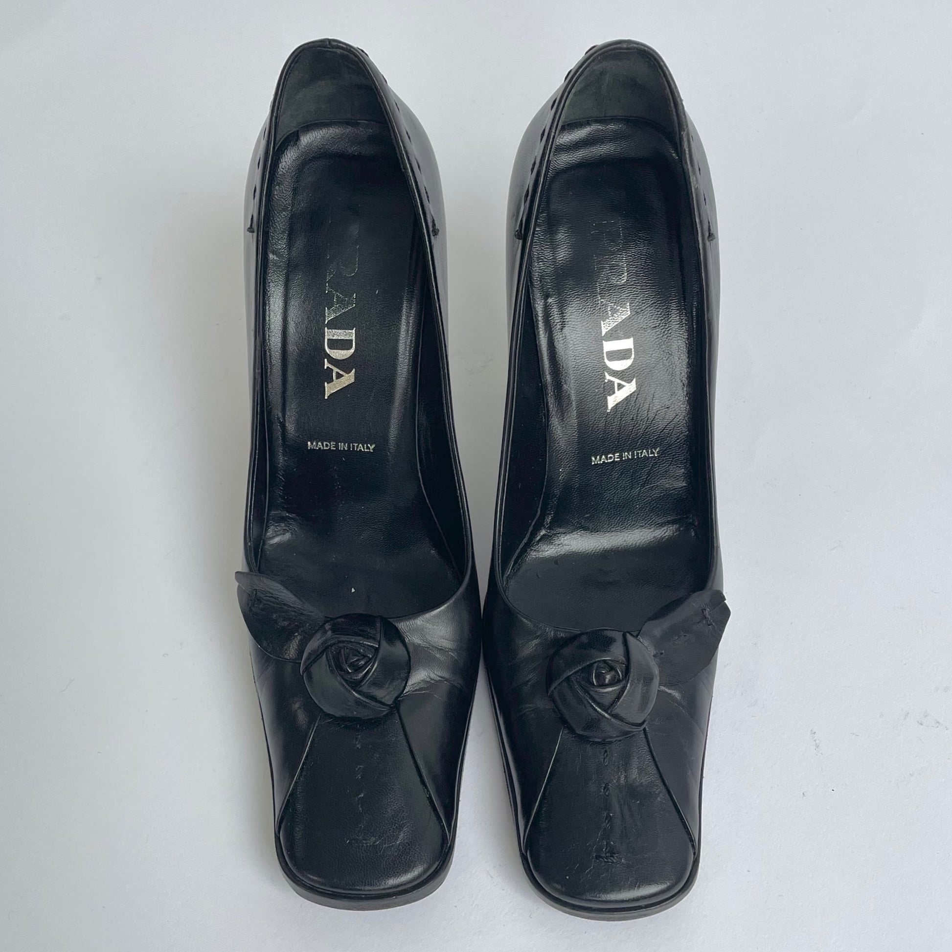 chic prada black leather square toe heels with rosette detail and stitching down the front. in beautiful condition minus a few slight scuffs. marked a size 35.5
