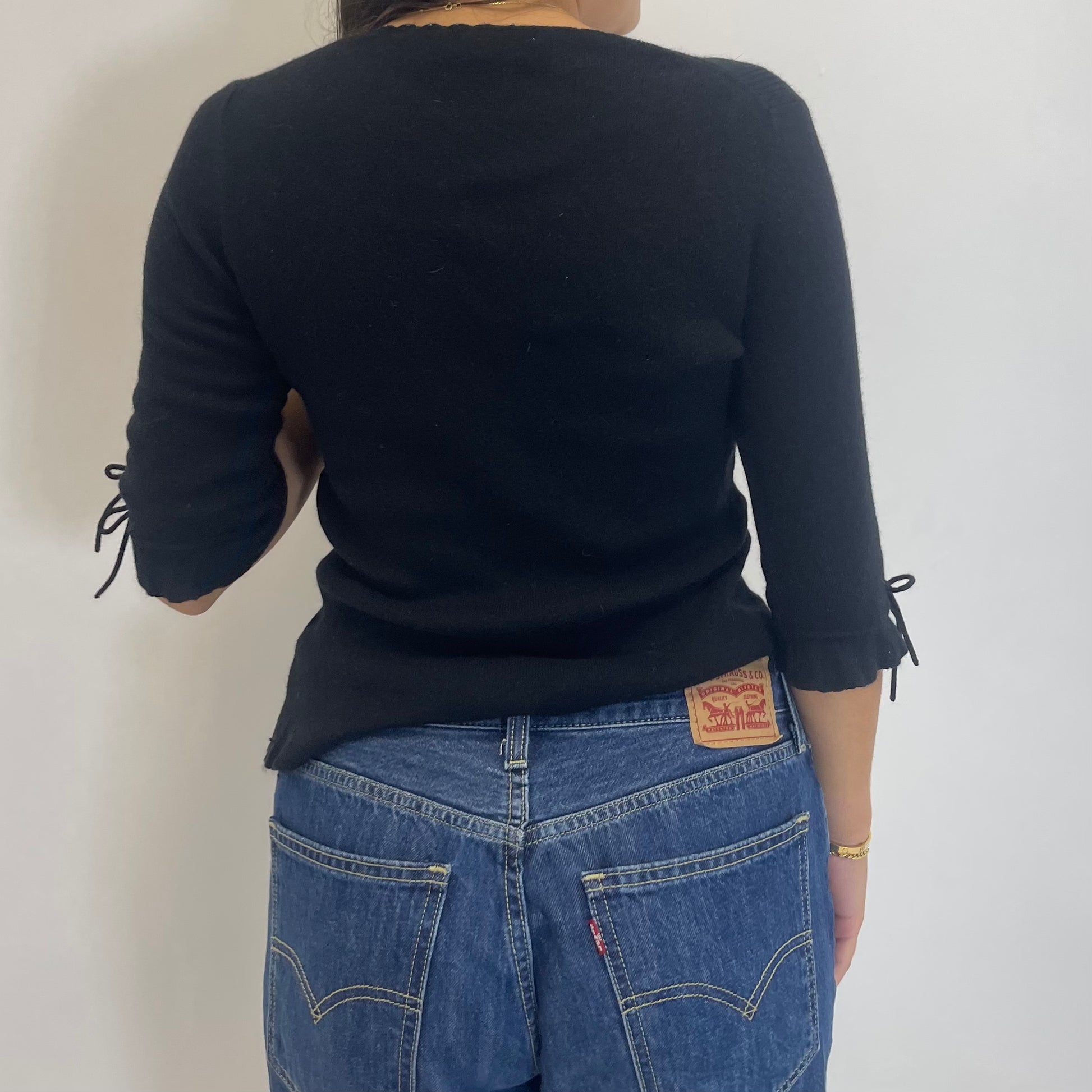 black quarter sleeve rebecca taylor cardigan with tie bow sleeves. pictured on a size small. labeled a size 2 but please refer to measurements below to ensure the best fit: